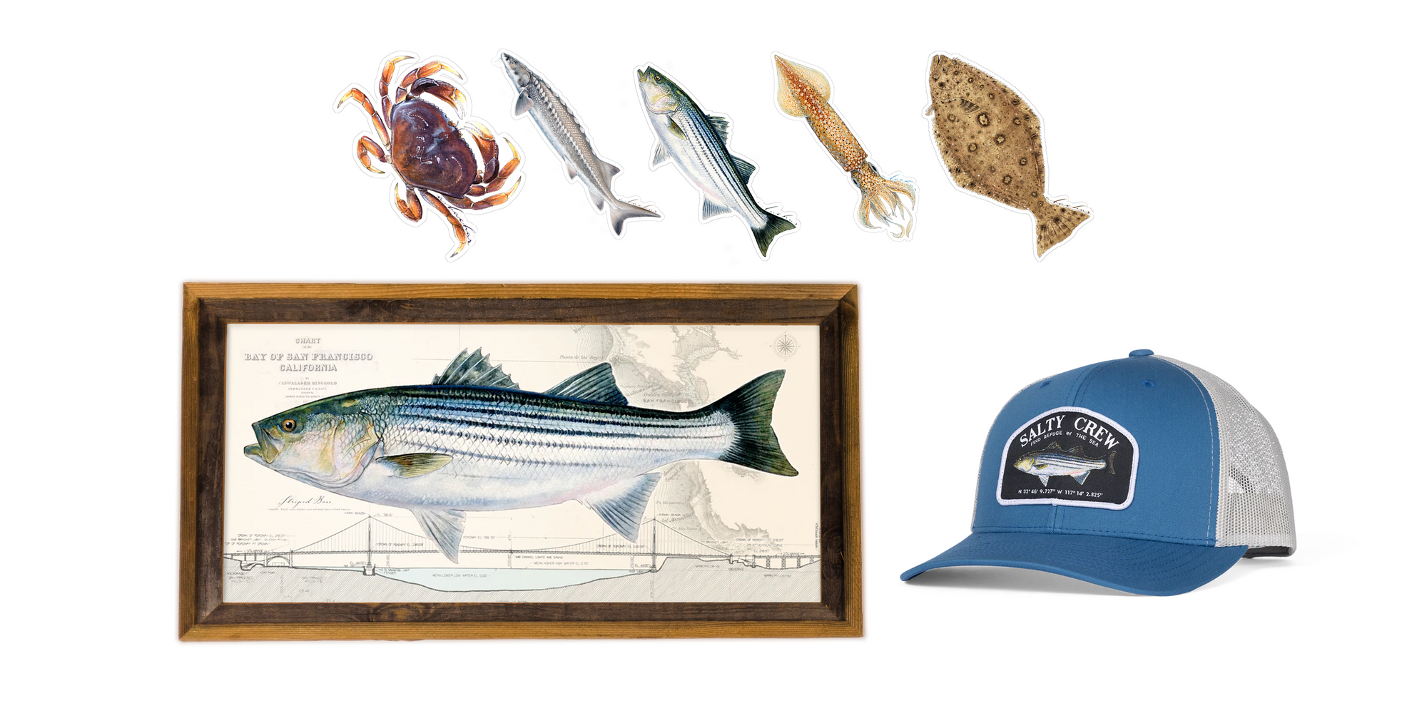 1- Nor-Cal Sticker Pack (dungeness, sturgeon, striper, squid, halibut)
